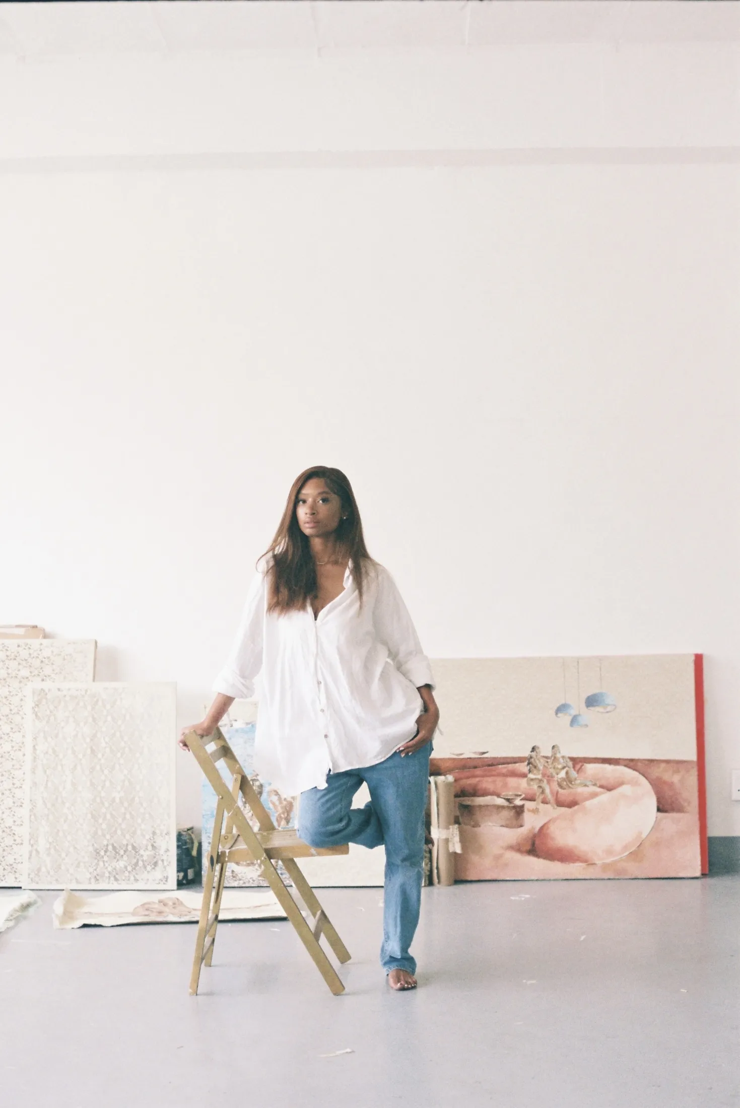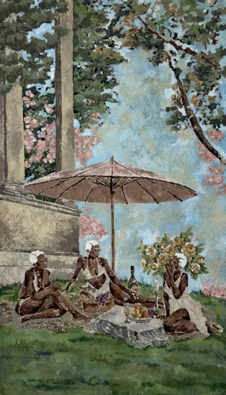 Through her use of acrylic paint and lace, she depicts Black women in soft, intimate moments, centering hyper-femininity as a space of power and self-determination. Her work reaffirms that Black women not only belong in spaces of grandeur but are also the architects of their futures. Paying homage to contemporary Black women’s craftsmanship and aesthetic performances, Nobakada’s art is an affirmation of the beauty and gentleness with which she sees herself whilst simultaneously teaching the world how to see her, and anyone else who sees any part of themselves reflected as they engage with her work.