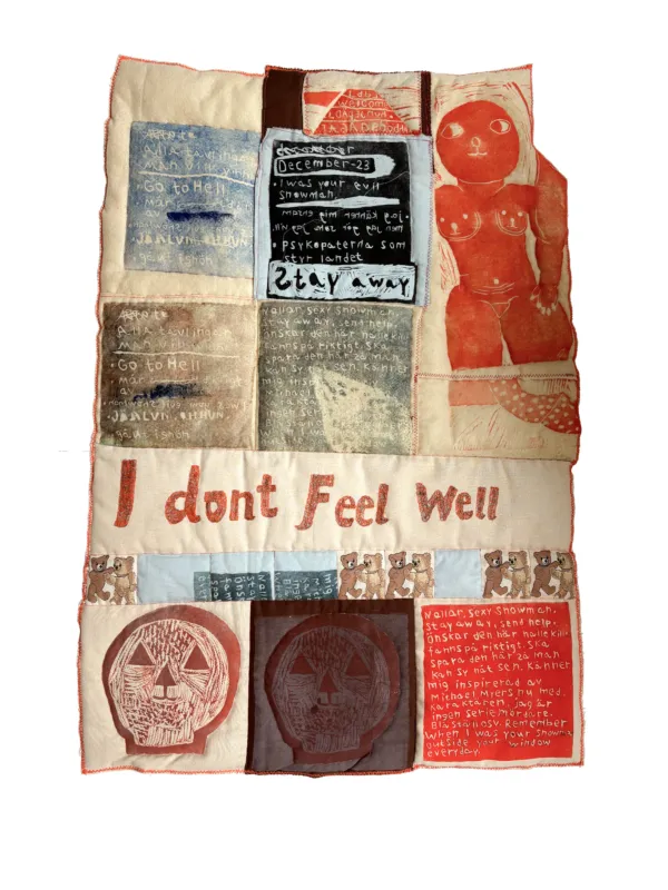 Tova Berglund uses textiles, plaster and quilting techniques, her works refers to childhood memories and experiences, the young girl and the grown woman side by side. But in the sweet innocence dwells also cruelty, anger, threats