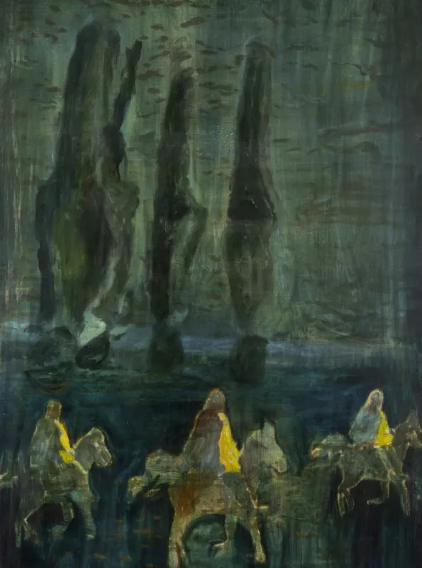 Johan Carlsson Ström’s compositions are muted in colour. The seemingly patinated paintings appear as aged, but cannot be pinpointed to any particular period. The images operate at a low frequency, murmuring or almost whispering their secretive content. Gradually, they draw the viewer into an enigma. The artist’s subtle references are not infrequently found within the world of true crime and horror films.